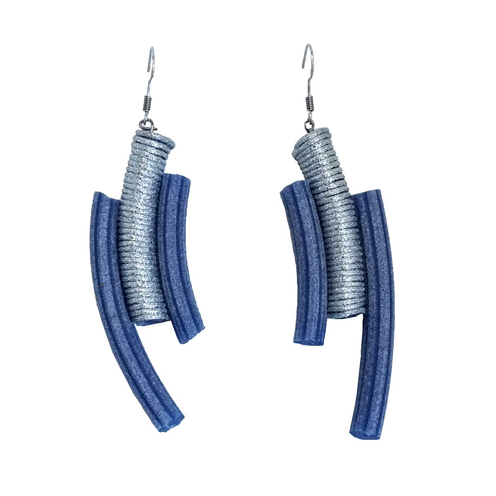Χειροποίητα σκουλαρίκια κρεμαστά από επαργυρώμενη κλωστή, κορδόνι από μπλε p. v. c. και ασημί κρεμαστό κούμπωμα