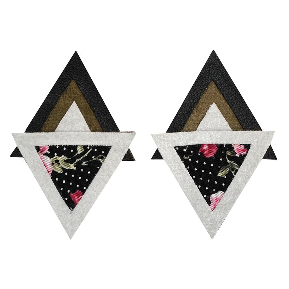Χειροποίητα γεωμετρικά σκουλαρίκια από floral βαμβακερό ύφασμα, suede γκρι και χακί, μάυρη δερματίνη και κούμπωμα καρφάκι