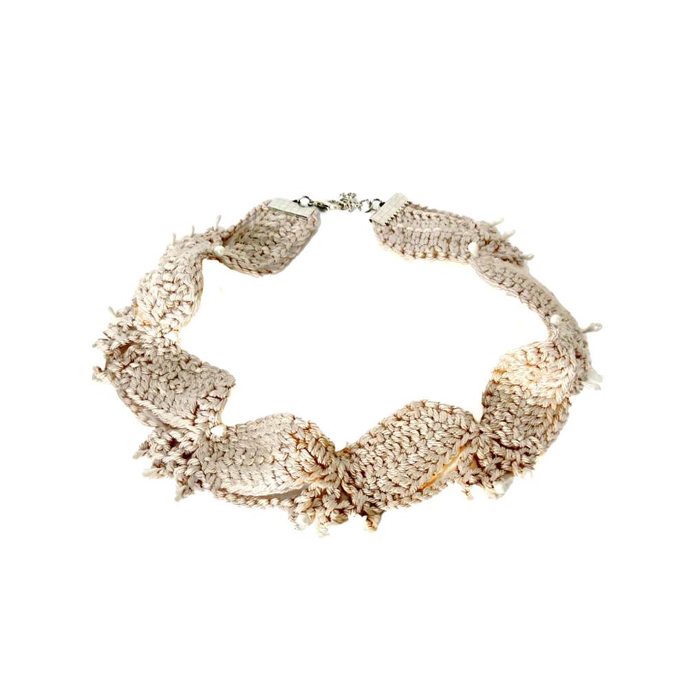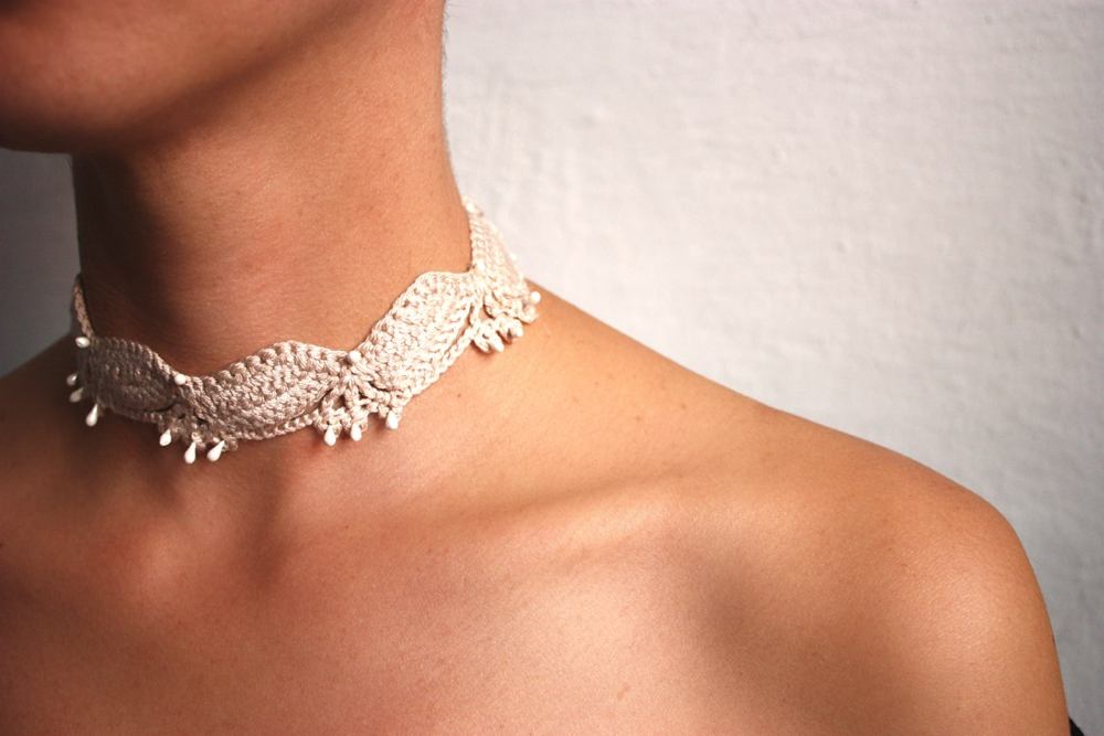 Kολιέ ckoker από χειροποίητη δαντέλα σε ροζ απαλο, μικρές ιβουάρ πέρλες και κούμπωμα από ασημί ακροδεκτη