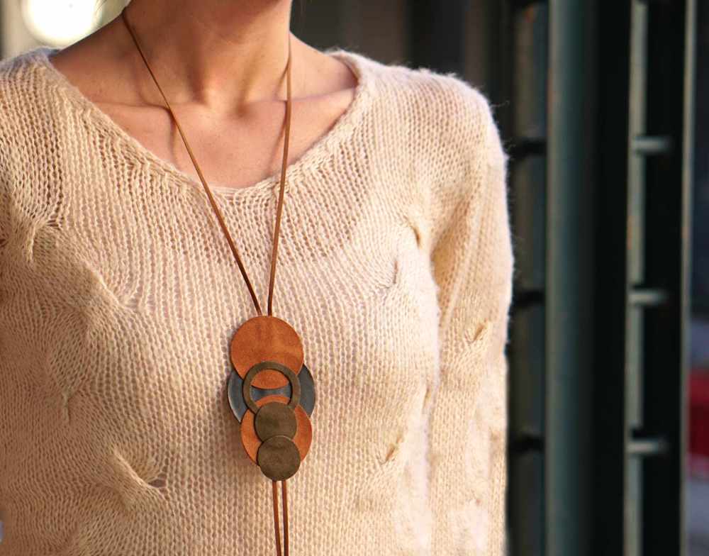 Χειροποιήτο μακρύ κολιέ από δερμάτινο suede καφέ κορδόνι και κύκλους απο χακί δερματίνη και καφέ, χακί suede