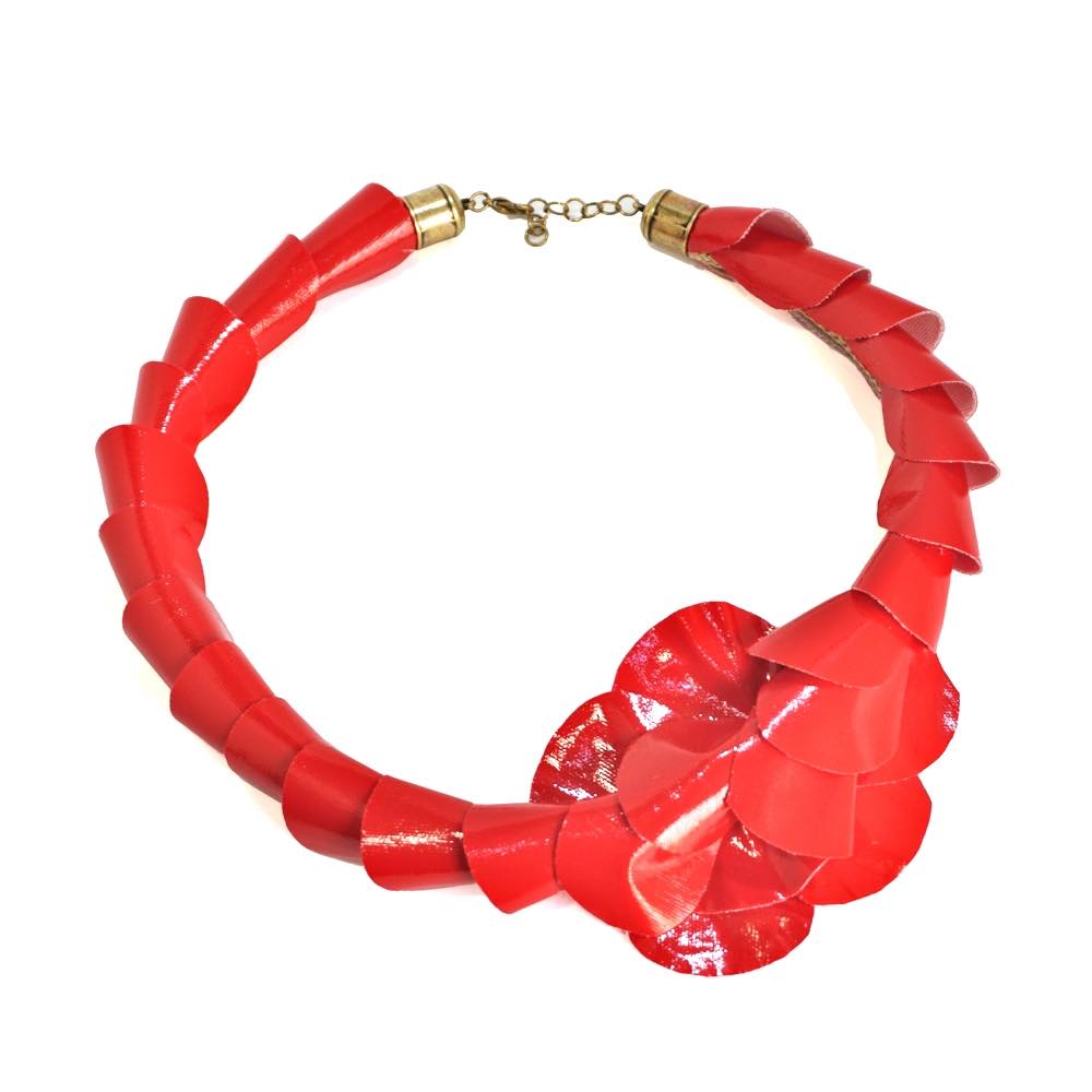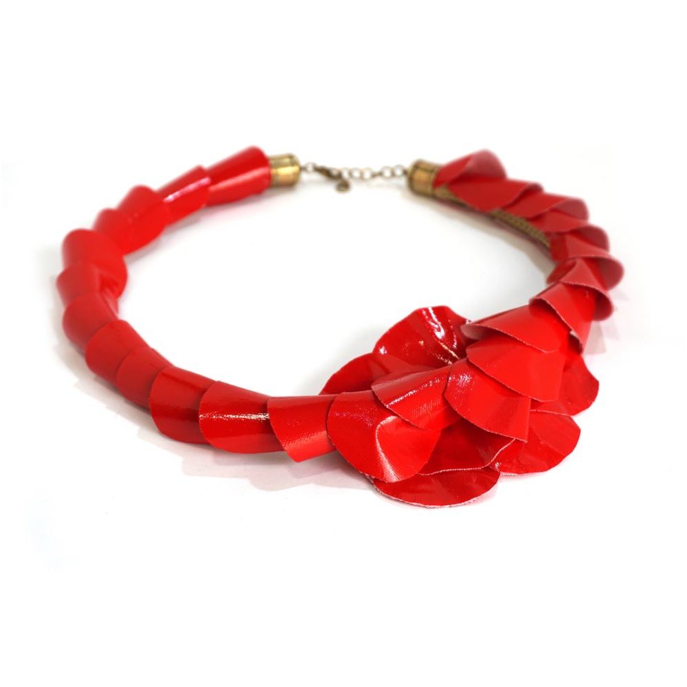 Χειροποίητο κολιέ από κόκκινα πέταλα vinyl και μπρονζέ ακροδέκτη