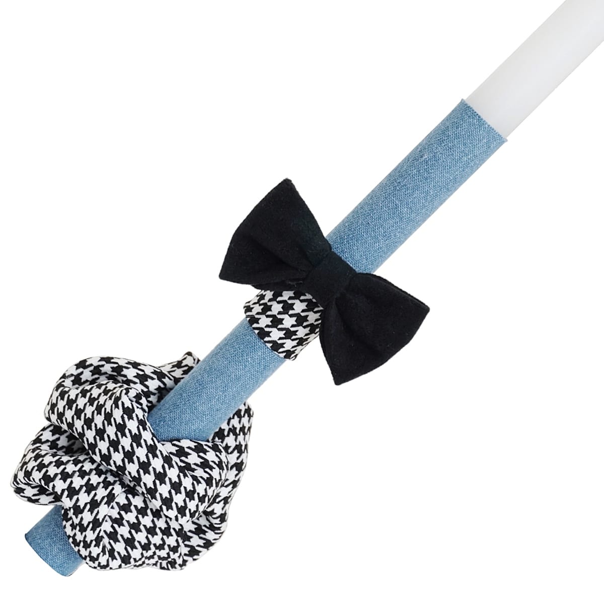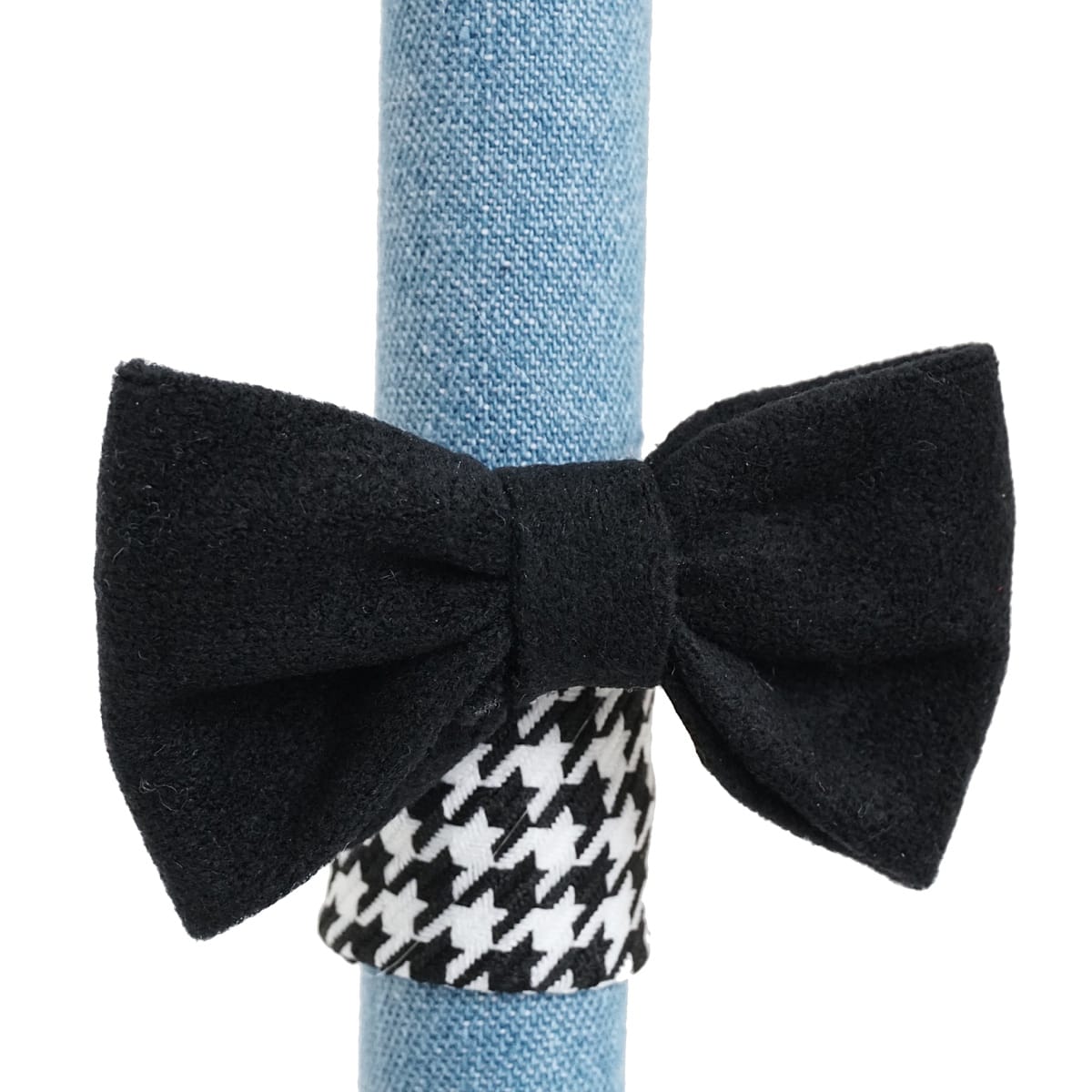 Χειροποίητη στρογγυλή λαμπάδα με scrunchie pied de poule, μαύρο suede φιόγκο και βάση από μπλε ανοίχτο denim.