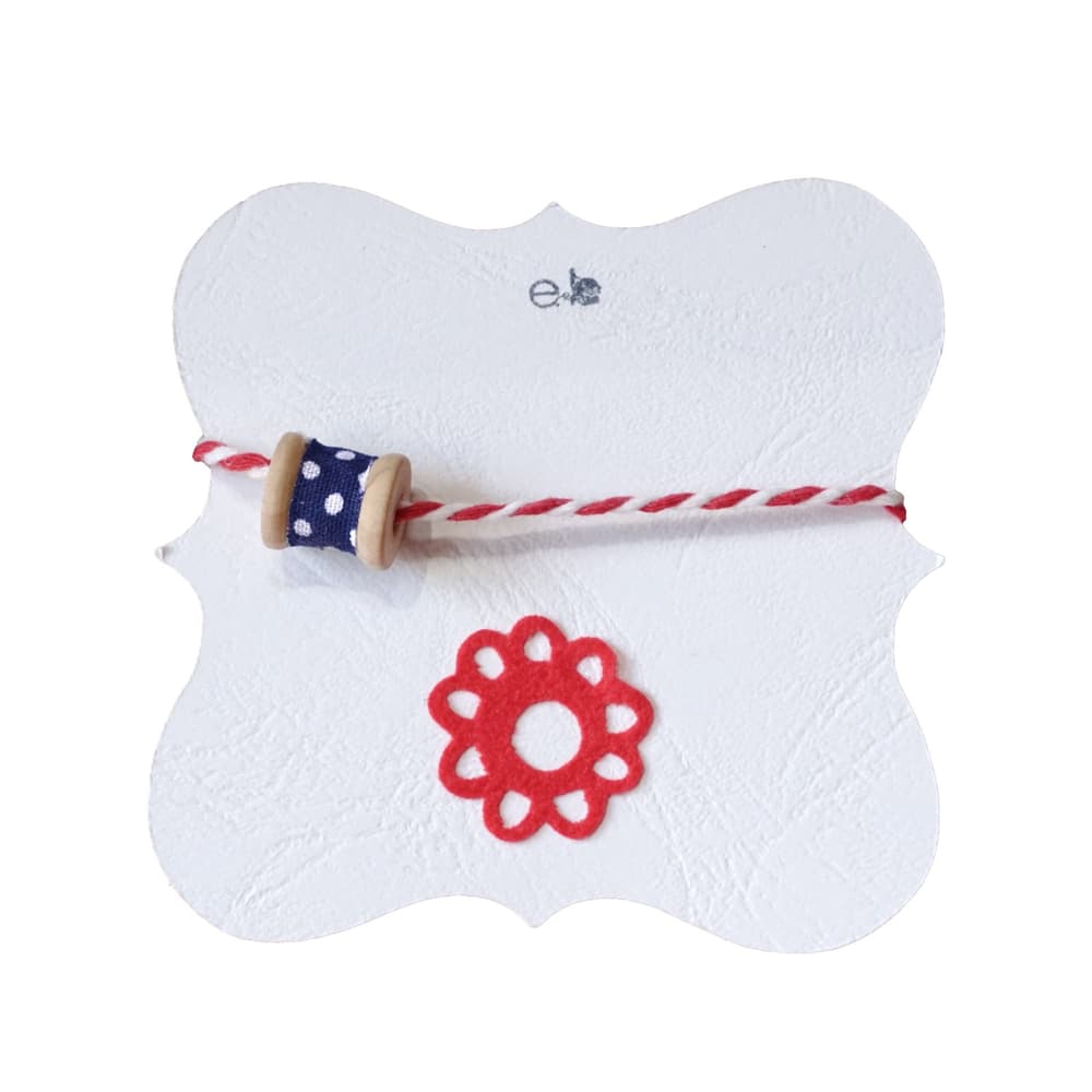 Χειροποίητο γυναικείο μαρτάκι με ξύλινο κουβαράκι με πουά μπλε ύφασμα και κούμπωμα παπαγαλάκι