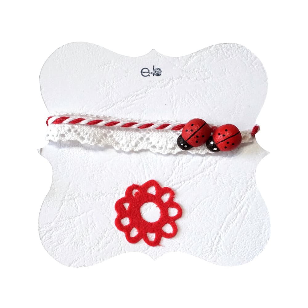 Χειροποίητο γυναικείο μαρτάκι με δύο ξύλινες πασχαλίτσες, βαμβακερή δαντέλα με κούμπωμα παπαγαλάκι