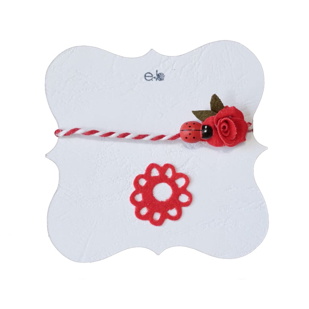 Χειροποίητο γυναικείο μαρτάκι με ξύλινη πασχαλίτσα και χειροποίητο κόκκινο τριαντάφυλλο με κούμπωμα παπαγαλάκι