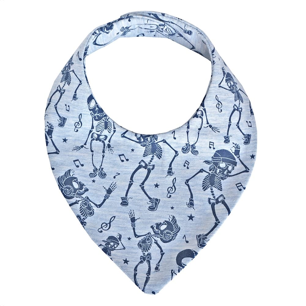 Χειροποίητη σαλιάρα για αγόρι από μπλε μελανζέ βαμβακερό ζερσεϊ με σχέδιο σκελέτους, ελεγμένο και πιστοποιημένο για βλαβερές ουσιές σύμφωνα με το Oeko-Tex Standard 100.