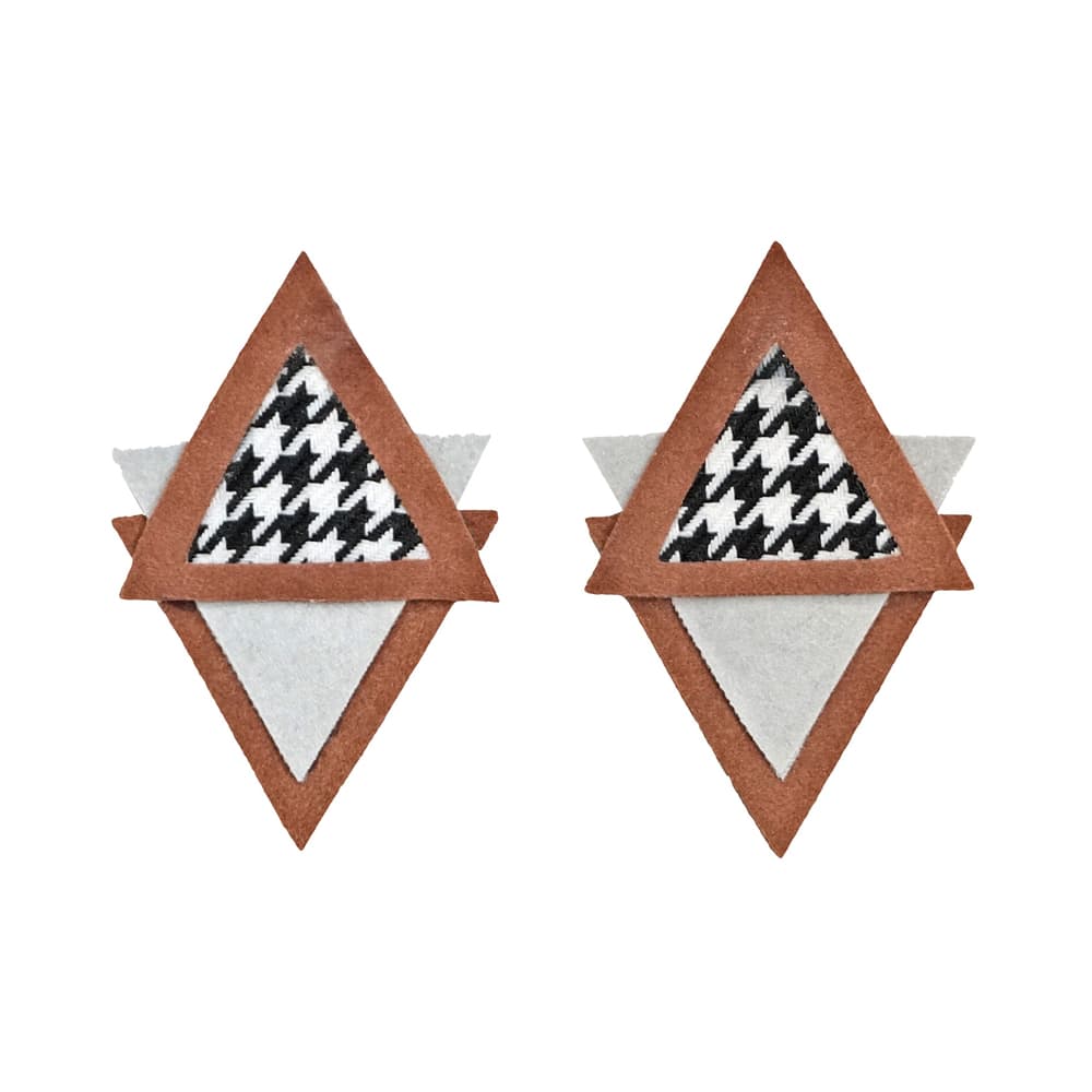 Χειροποίητα γεωμετρικά σκουλαρίκια από ταμπά, γκρι suede, ύφασμα με σχέδιο πιε ντε πουλ και κούμπωμα καρφάκι