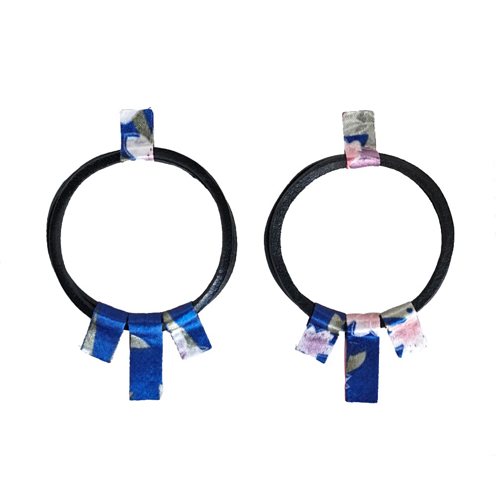 Χειροποίητα σκουλαρίκια κρίκοι από μαύρο δέρμα και floral μπλε ύφασμα με κούμπωμα καρφάκι.