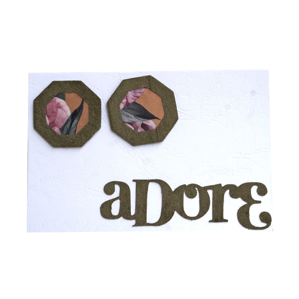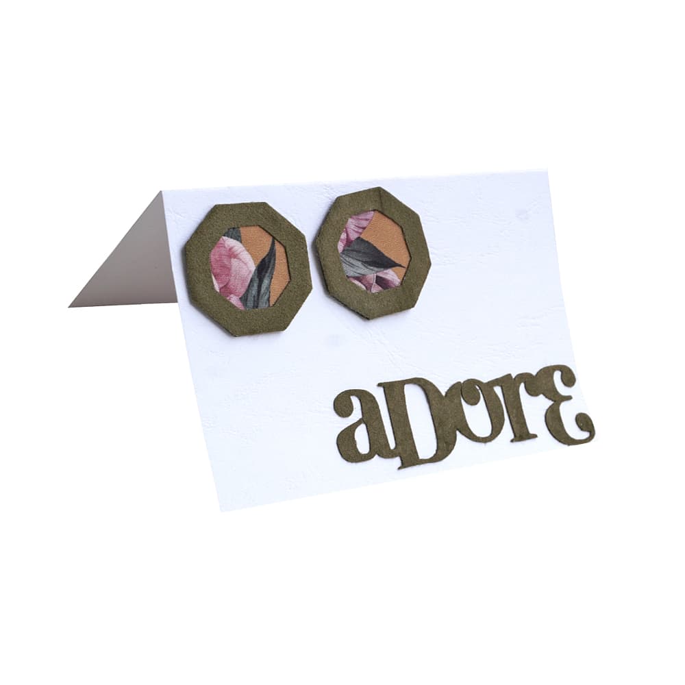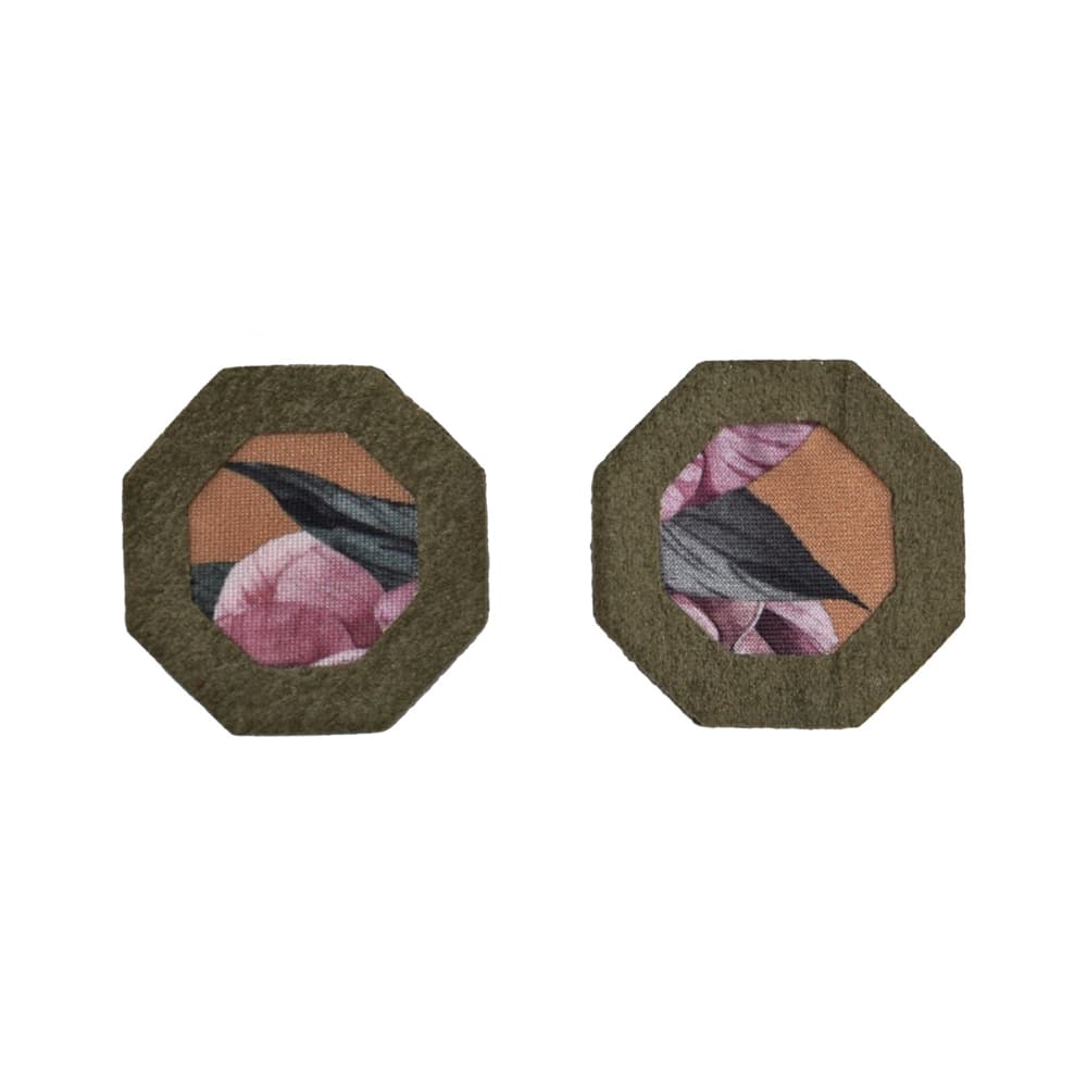 Χειροποίητα σκουλαρίκια πολύγωνα από χακί suede, floral ύφασμα, κούμπωμα από καρφάκι και χειροποίητη λευκή κάρτα Αγίου Βαλεντίνου