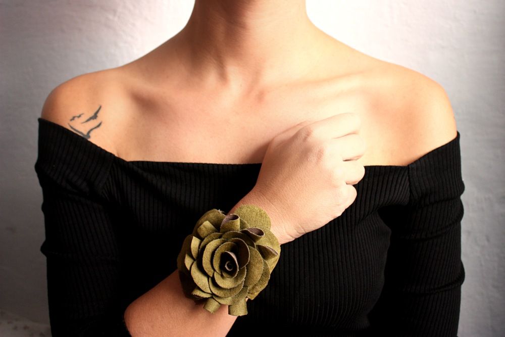 Βραχιόλι περικάρπιο από suede χακί πέταλα